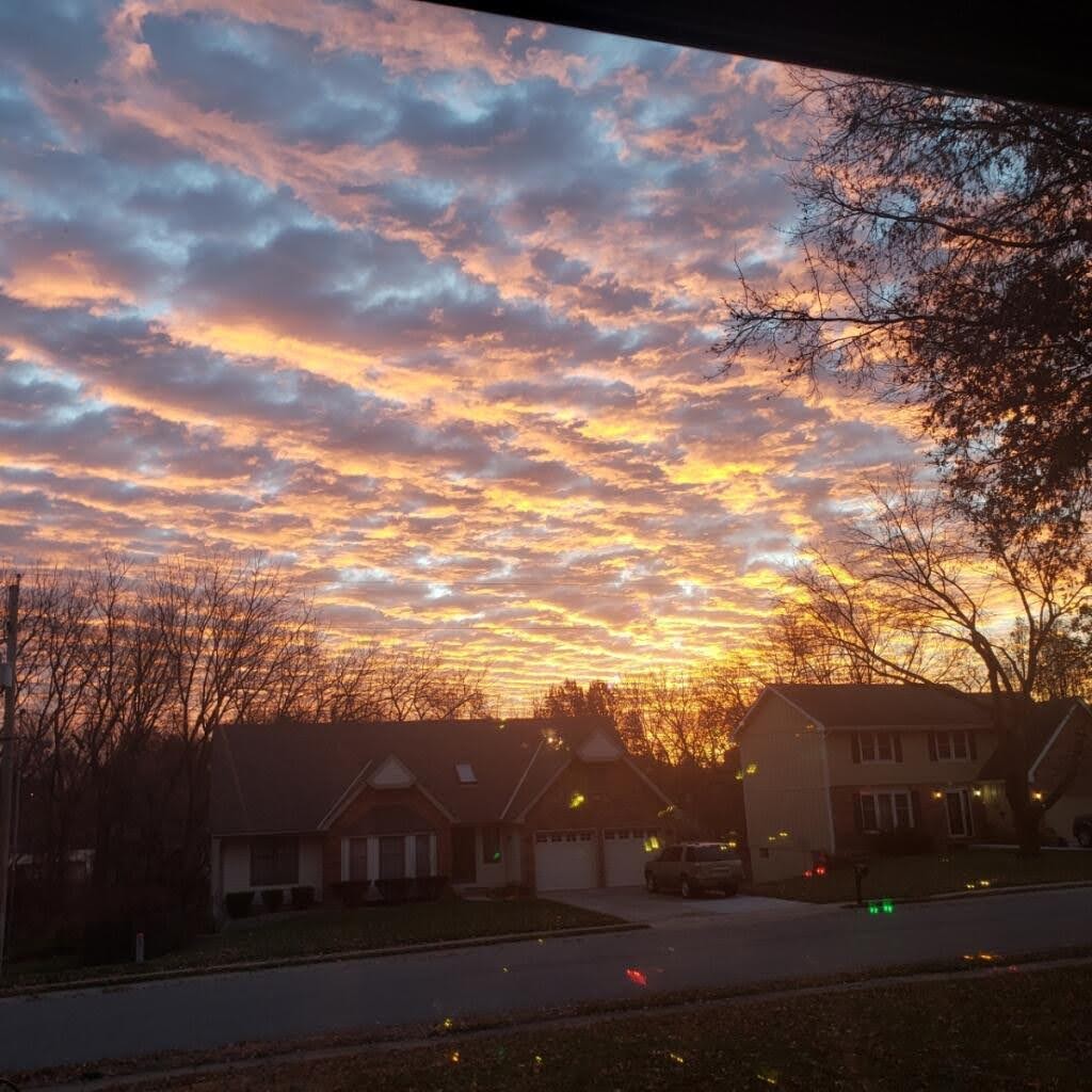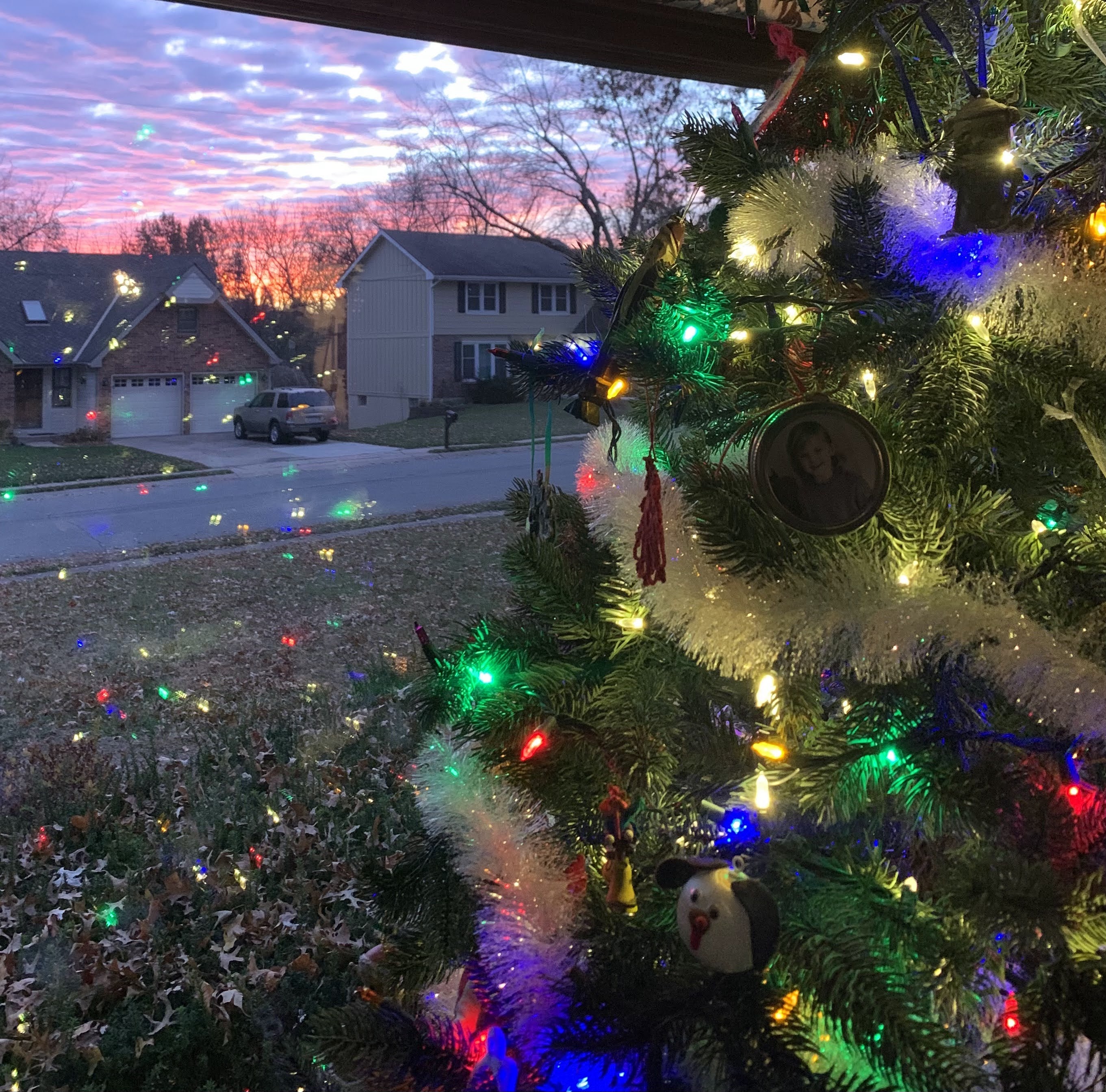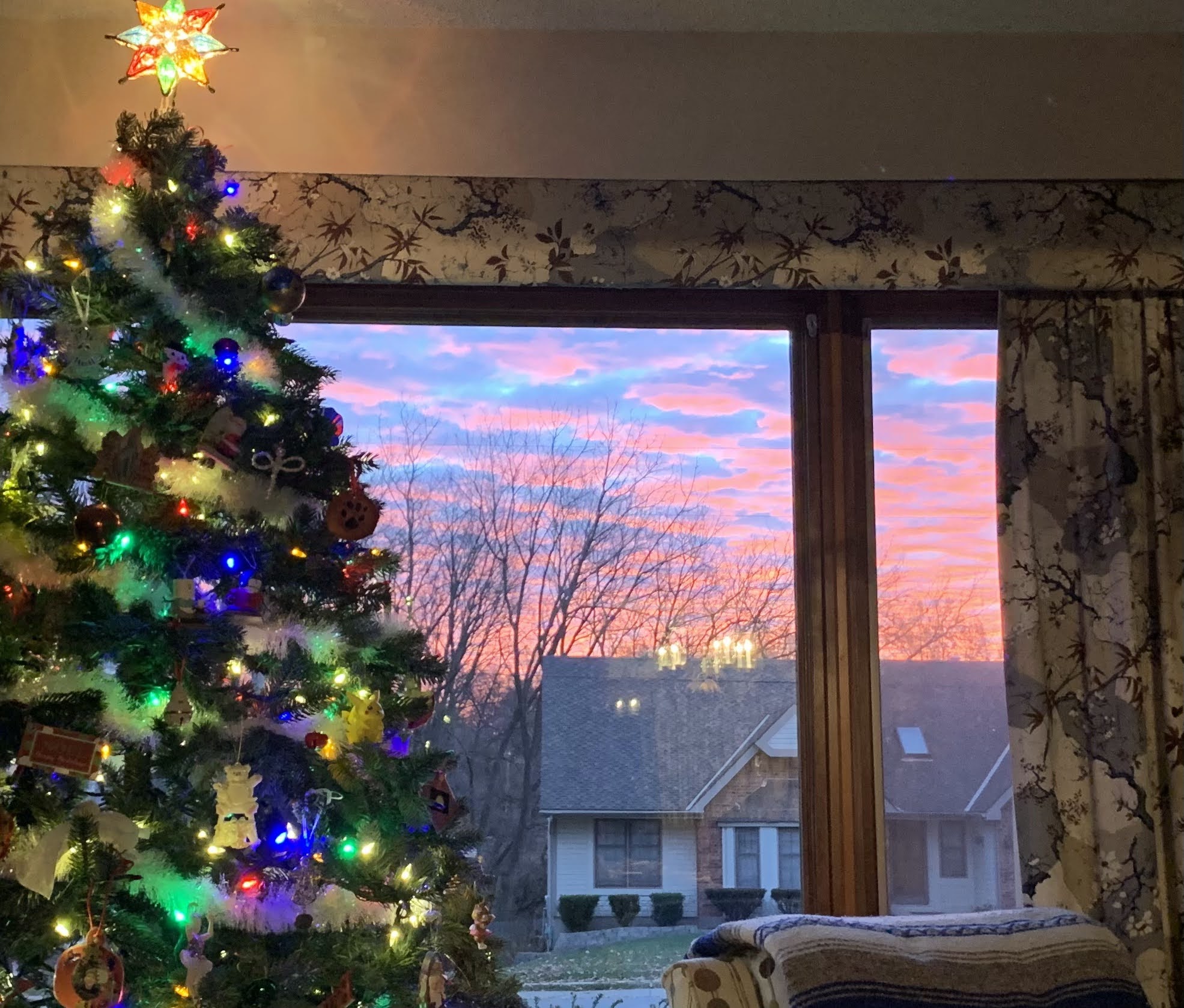 I’m sitting here this morning in the quiet of the house, before anyone else is up, watching the sunrise behind the Christmas tree. It’s beautiful. The pinks and purples and reds… It’s just… magnificent.