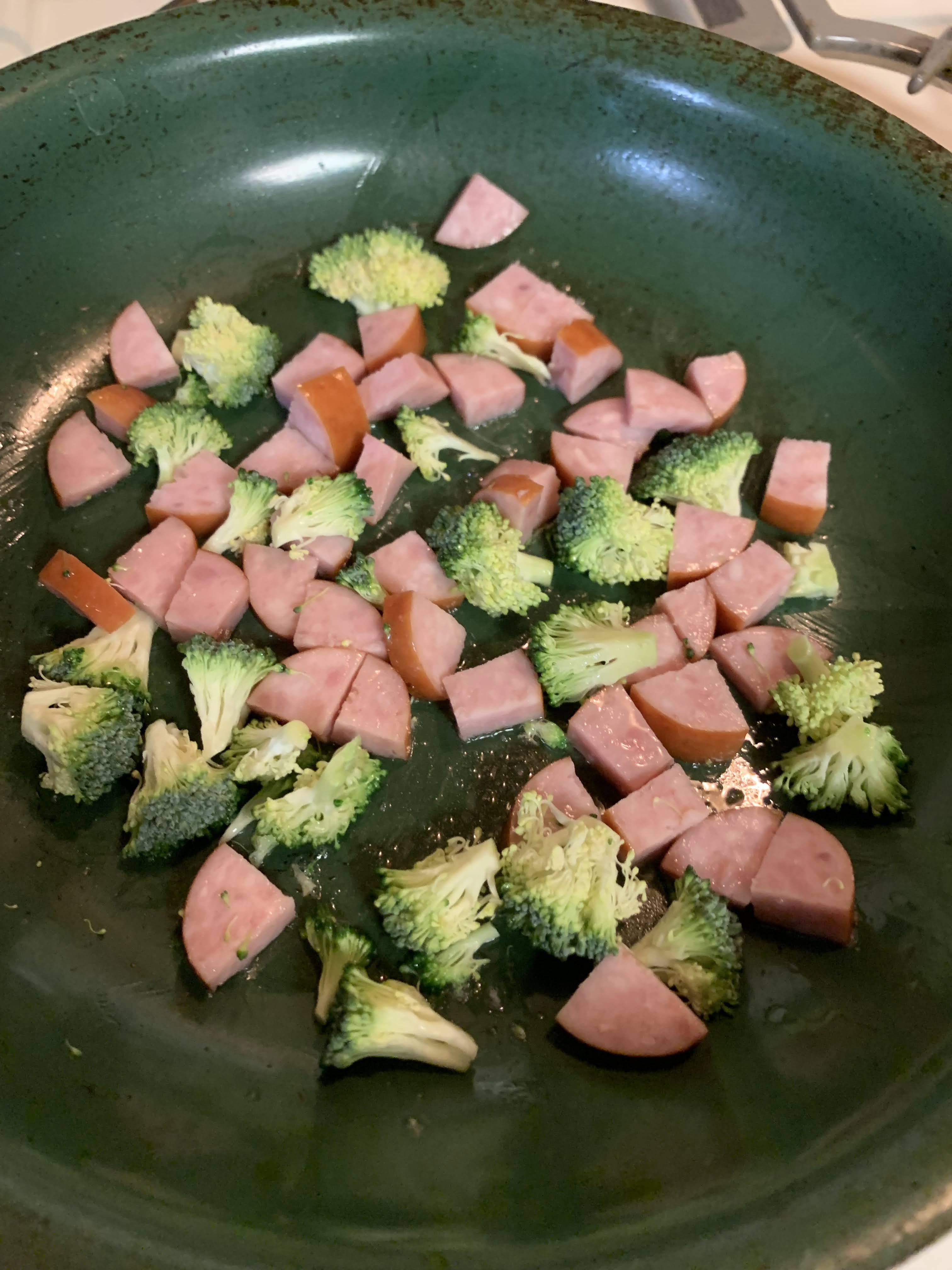 I started with some Broccoli and a little bit of smoked sausage. Not traditional breakfast foods but they turned out yummy!