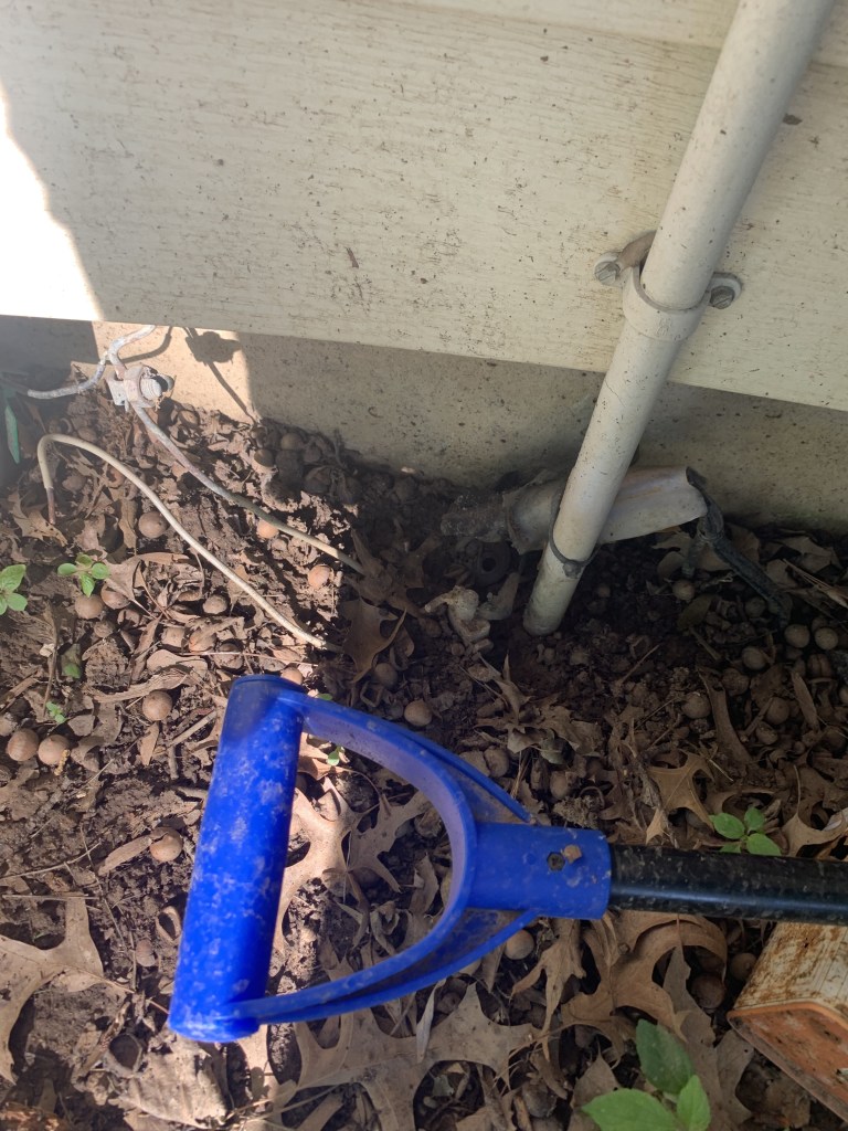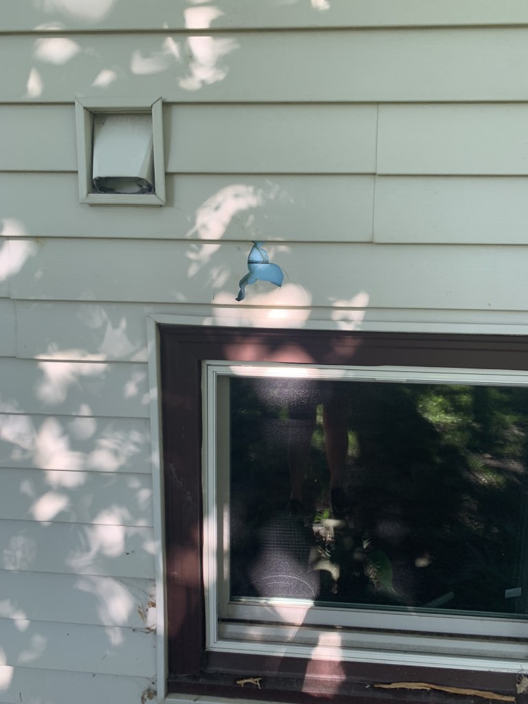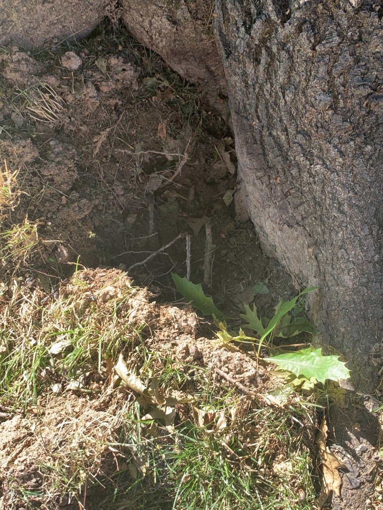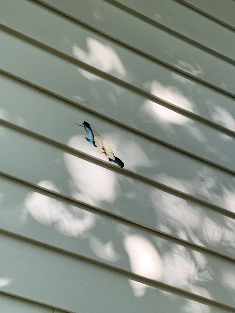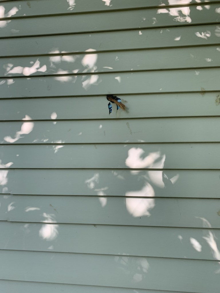 I shooed the buzzard away and found a dead squirrel… but I also noticed that a little shepherd’s hook plant holder that I had near one of our trees was laying down and there was a huge hole and the cover to a utility box on the house was in the hole… Now, I’m like WHAT???? so I investigate and notice that it’s black where that utility box touches the ground and run in and tell my husband to hang up the phone (he was on hold) and come see. I think I know what the problem is… as we continue to look around the yard we see some holes in our siding… very random holes, and then as we turn around to look at the other tree in the yard we see it… It has been struck by lightning.