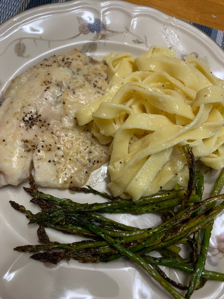 Last night we had the most amazing home cooked dinner. Grilled Tilapia with Lemon Pasta and asparagus . It. Was. Wonderful. I’m not kidding! The tilapia recipe came from Princess Pinky Girl. I was skeptical but DH took one bite and said, “Oh my! That’s really good!” This recipe I followed exactly and DH grilled it and the asparagus for us. I just seasoned the asparagus with olive oil and salt and pepper. YUM! Then the pasta… I saw CucinaByElena making this on Instagram and had to try it. It was delicious. I followed this recipe as written and it turned out so yummy. Well, except for the pasta. I used a wider noodle than the spaghetti she used because it’s what I had.