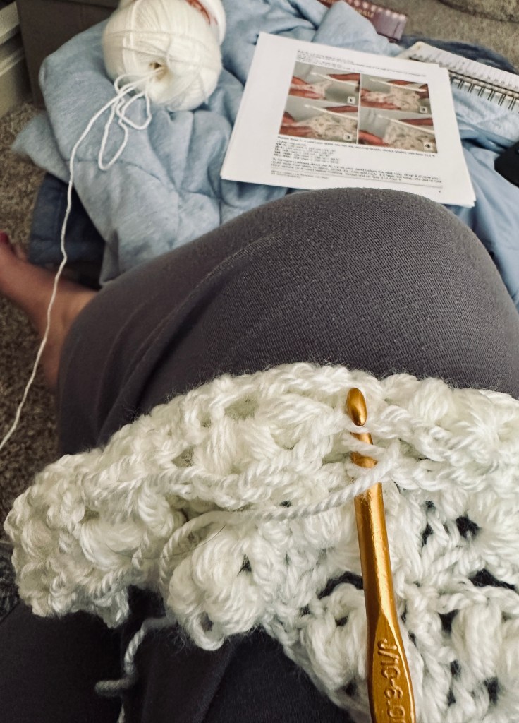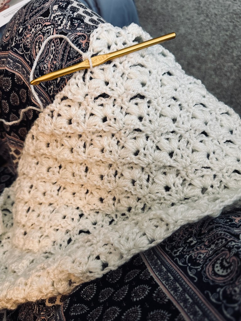 Today, I’ve been busy working on a bridal shawl. I’m so excited about this project!! One, because it’s for a beautiful bride (my DD) and two because I’ve been searching for a pattern for this project for about 5 years and if I ever found a pattern at all it was one for knitting not crochet, but I’ve finally found one for crochet! So, I’m so happy and excited about this! So far so good!